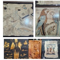 114 AND 115 AND 170 INCLUES STUNNING Framed and glazed Sketch and line naive style picture on Fabric large, 92 X 88 cm , Coloured framed and glazed line drawing of parrots in naive style on Fabric large, 74 x 64 cm ALSO Egyptian related items including a wood relief carving and a painting on Papyrus.Hammer: £ 5