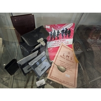 Job lot to include London Midland and Scottish Railway (LMS) train services timetable, specifically for the Preston, Carlisle, Lake District, Furness and West Cumberland routes. It is dated October 6th, 1941, and is marked to be in effect "until further notice" and originally priced at twopence. Brush, spoon and camera items.Hammer: £ 3