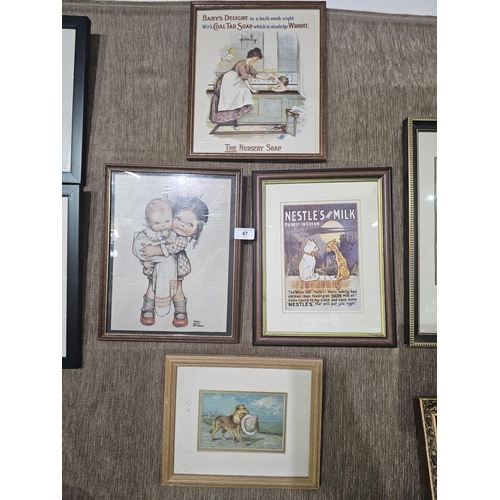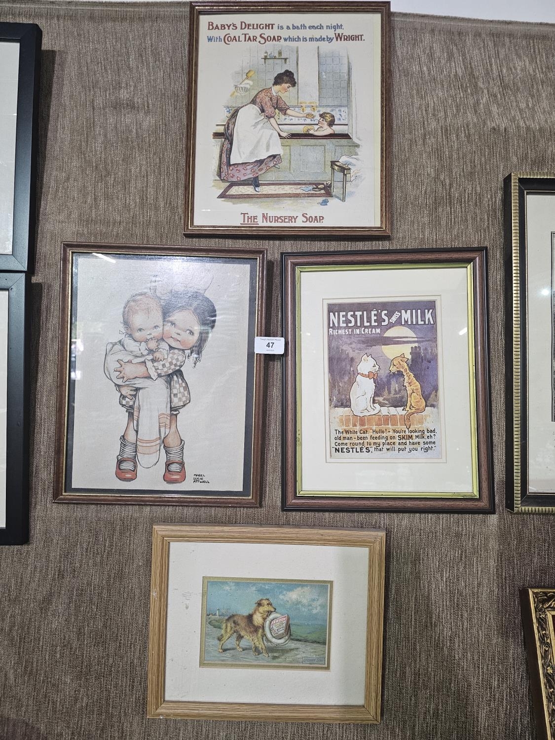 Four framed vintage advertising prints featuring lifebuoy, Nestle etc