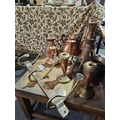 Collection of brass and copper pitchers and vases plus a quality brass coat rack