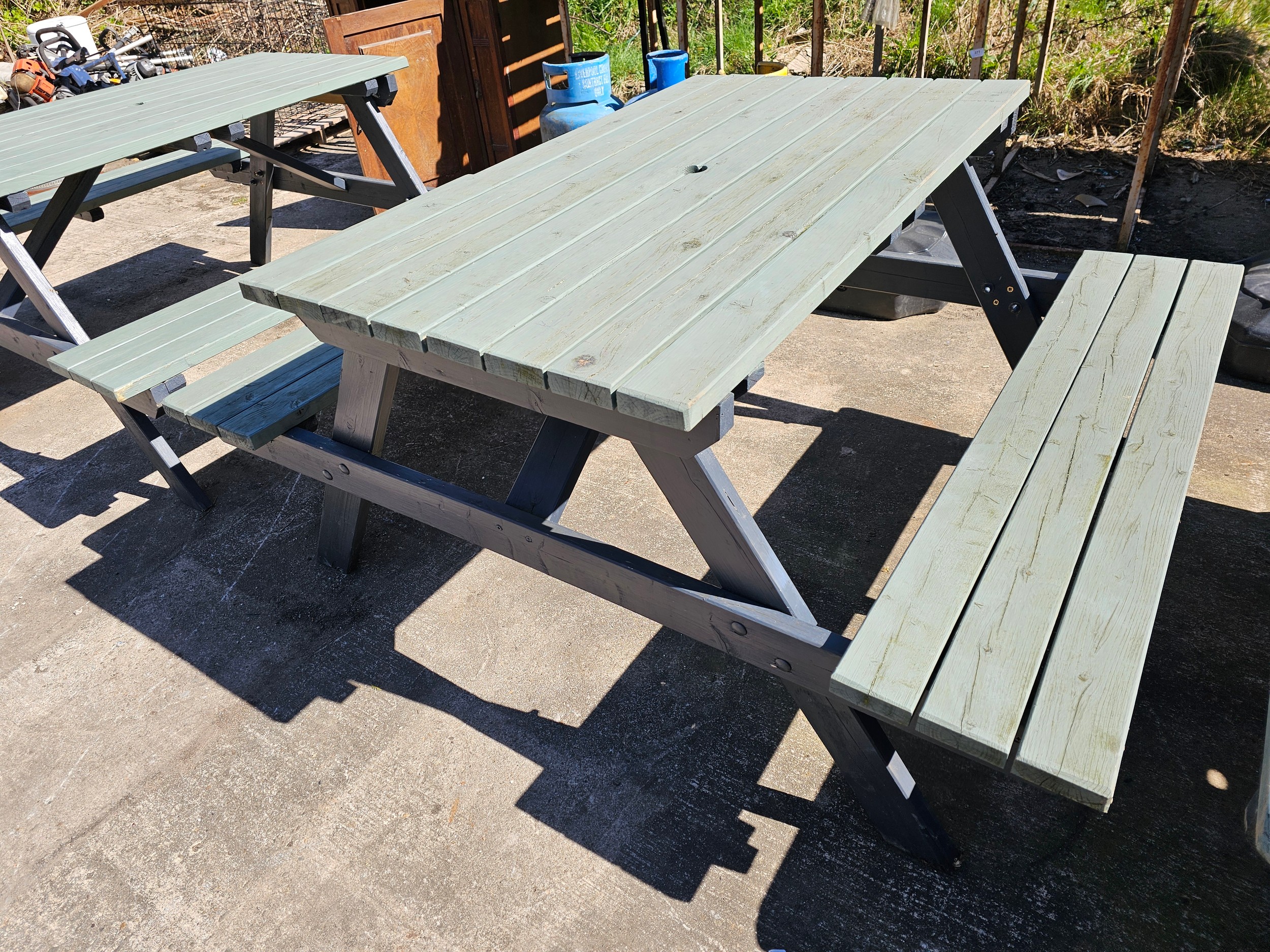 Rectangular picnic table with an A-frame structure and attached benches, painted in green and grey