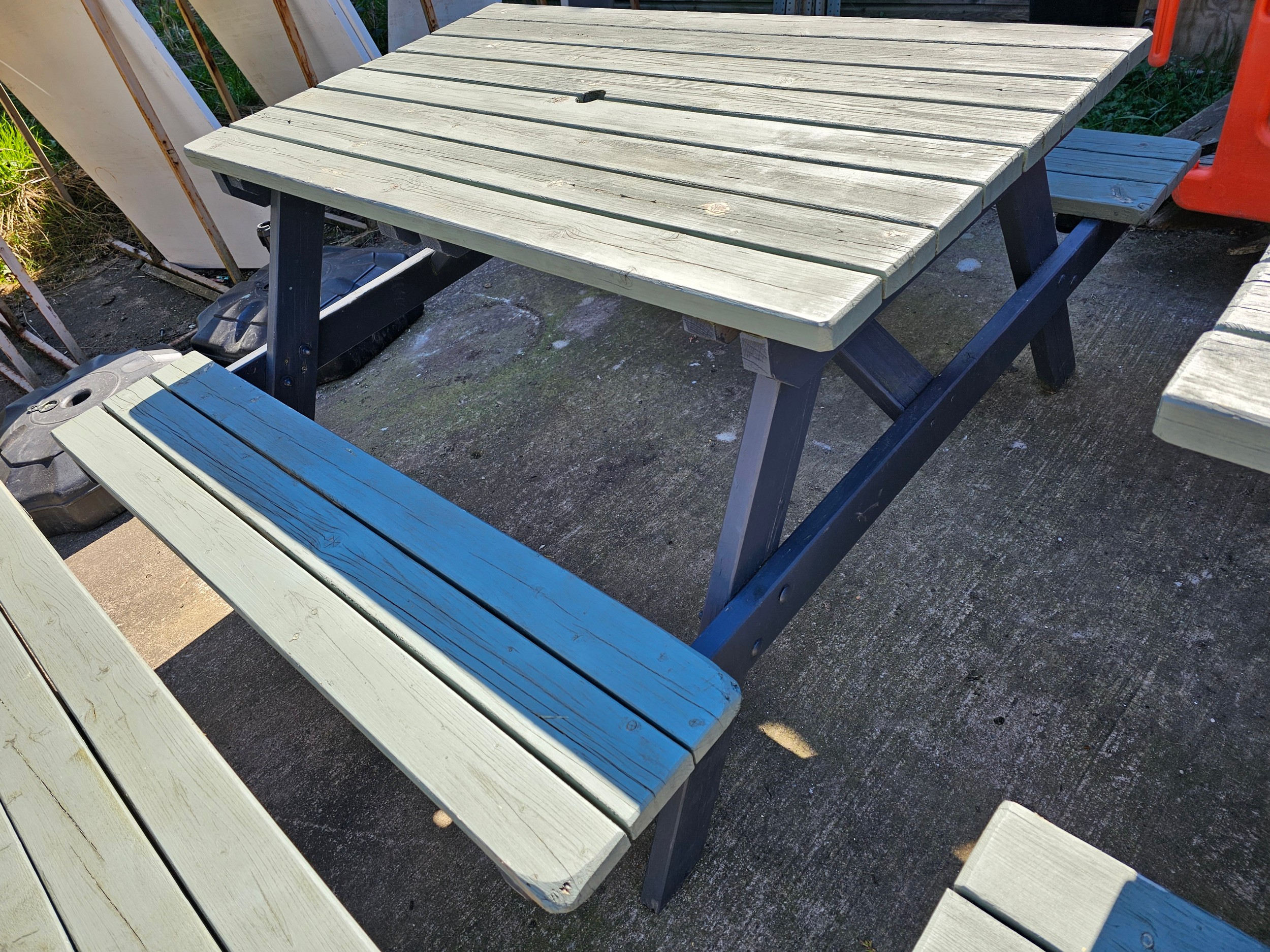 Rectangular picnic table with an A-frame structure and attached benches, painted in green and grey